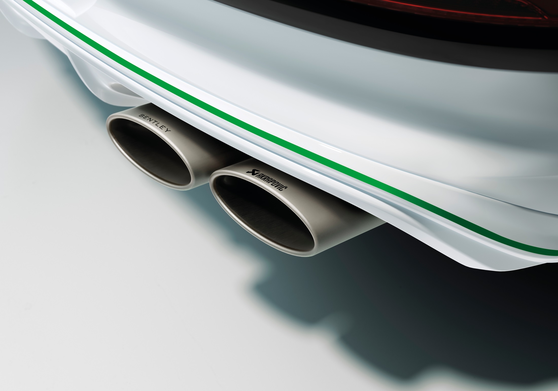 De motor is niet alleen krachtiger dan zijn voorgangers, maar ook karaktervoller. Standaard is de Bentayga Speed uitgerust met een sportuitlaatsysteem, dat een rijke, krachtige motorklank levert die het gretige karakter van de krachtige V8 complementeert en een diep gevoel van betrokkenheid bij de bestuurder bevordert. Deze uitlaat is aan de buitenkant te herkennen aan twee elliptische uitlaatpijpen die door de diffuser aan de achterzijde naar buiten komen. Voor een nog spannendere soundtrack accentueert de optionele titanium Akrapovic-uitlaat de kracht, dramatiek en potentie van de V8, met zijn auditieve expressie van de prestaties die bij de geringste gasdruk te verwachten zijn. Dit systeem is voorzien van vier uitlaatpijpen.